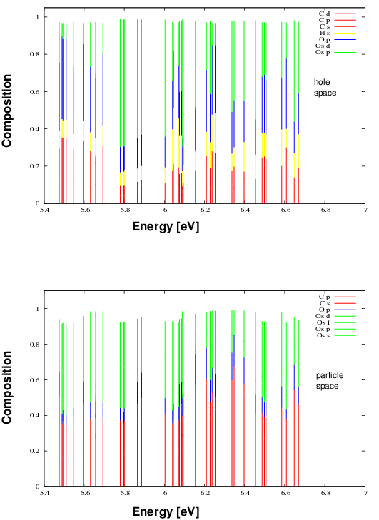 This graph shows sizeable osmium contributions in the hole and particle space being responsible for SO coupling effects in the excitation spectrum (see below).