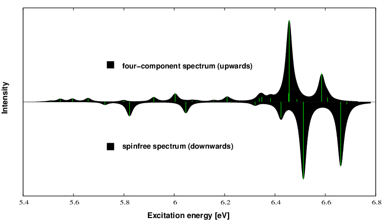 Upwards we plot the X2Cmmf spectrum, downwards the SPINFREE spectrum which exhibits the pure effect of spin-orbit coupling on the excitation spectrum. Soon an integrated python tool will come combining all the individual tasks from above.