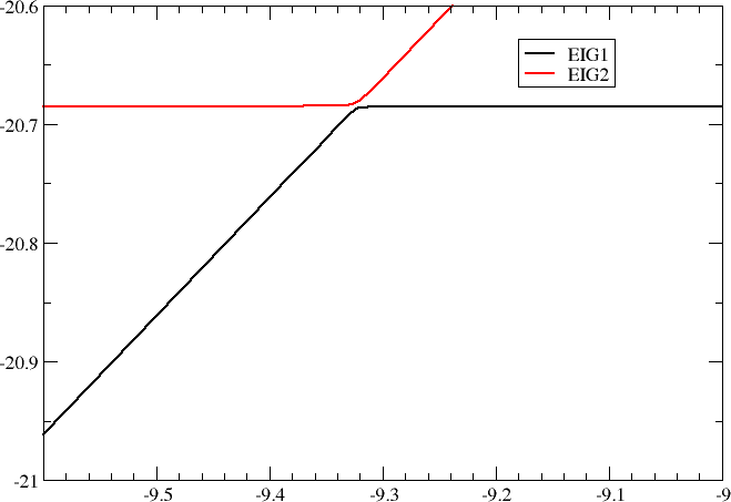 By scanning shift values in the resonance region we obtain the following plot of orbital energies of the two lowest occupied molecular orbitals