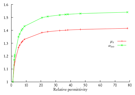 This will produce a different output file for every different solvent in the array. One can collect the results for dipole moments and isotropic polarizabilities and plot them against the relative permittivities. This was done in [DiRemigio2015] for the \(\mathrm{H}_2\mathrm{Po}\) molecule: