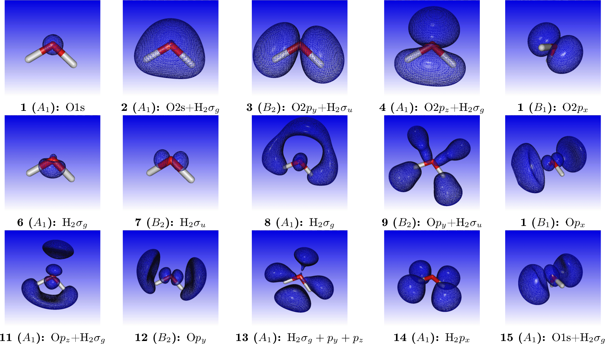 where we have added by hand the most important virtual orbitals. For reference, orbital densities of the fifteen first canonical HF orbitals of water are given below