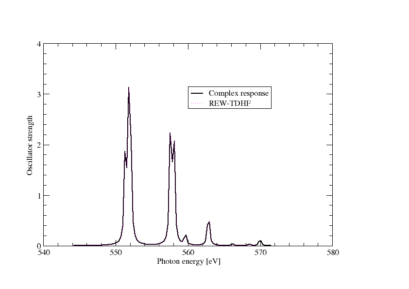We can alternatively obtain the above spectrum from complex response. The isotropically averaged ocillator strength associated within the electric dipole approximation is related to the isotropic electric dipole polarizability through the relation